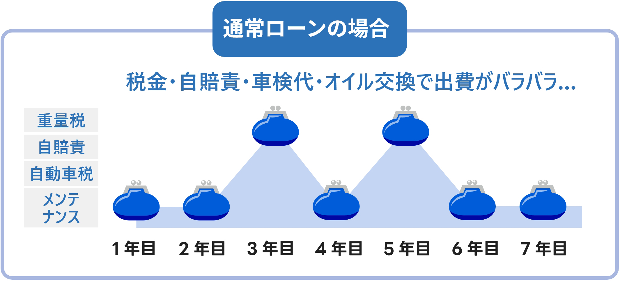 毎月のお支払い額には、車両代だけでなく車検代・自動車税・自賠責保険・オイル交換などの基本的な維持費が全て含まれているので、まとめた出費を気にせず安心してカーライフを楽しめます。